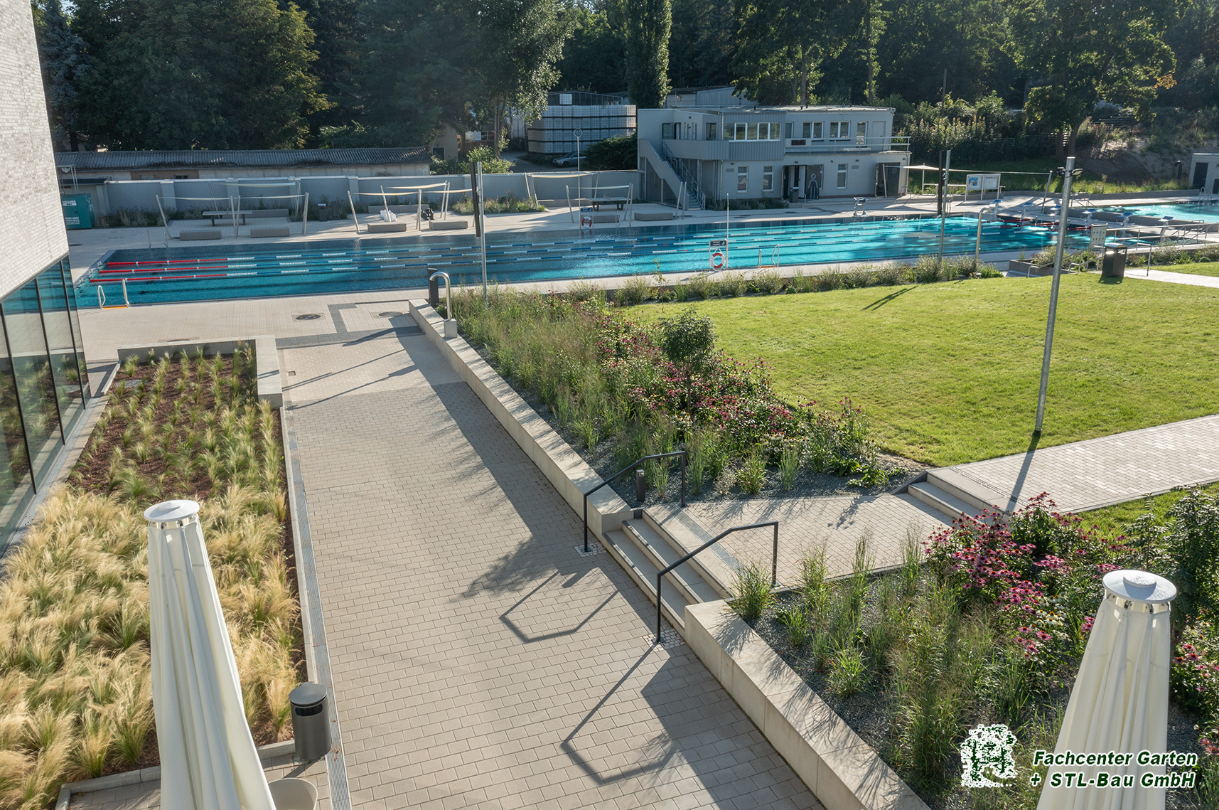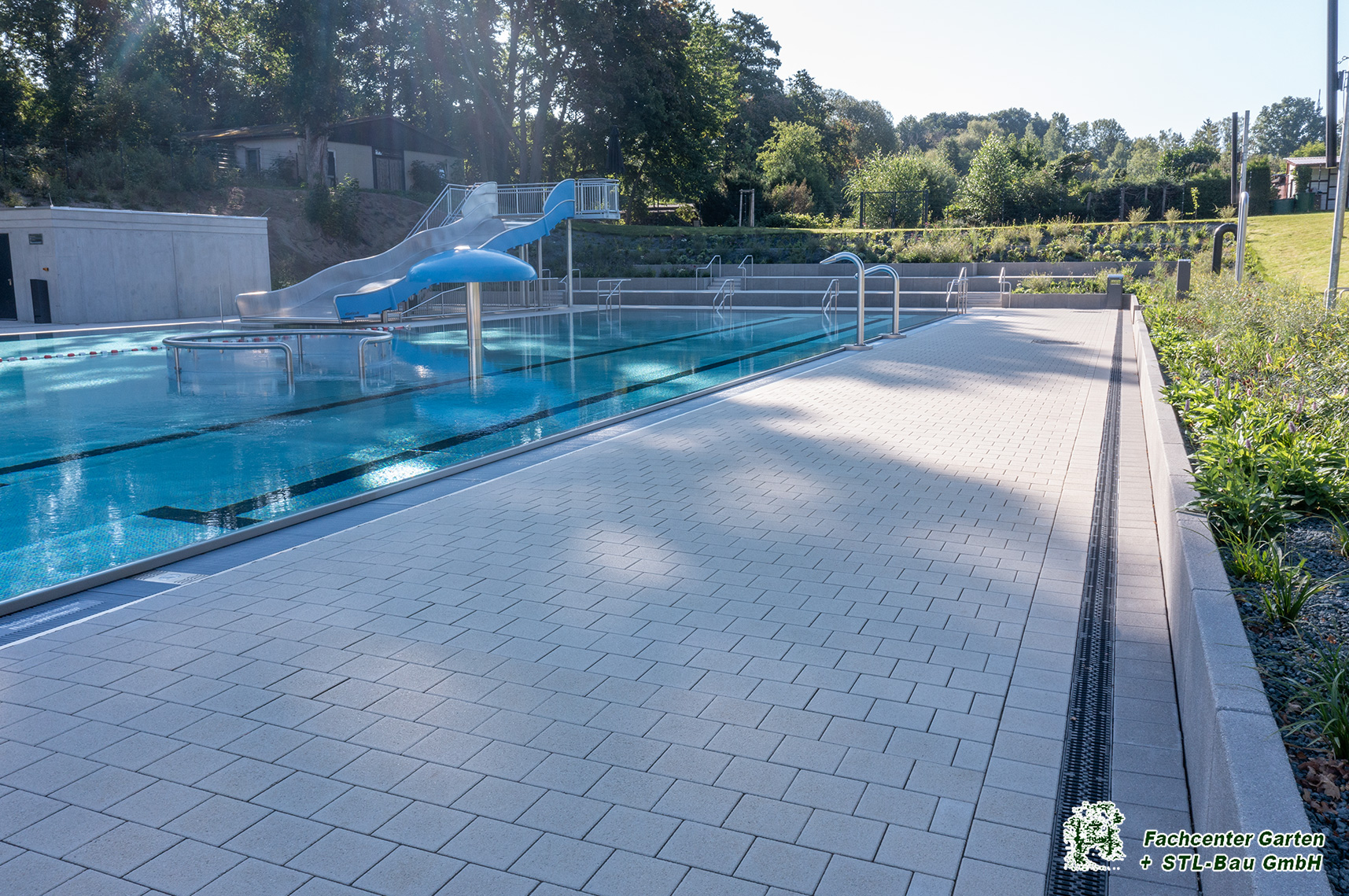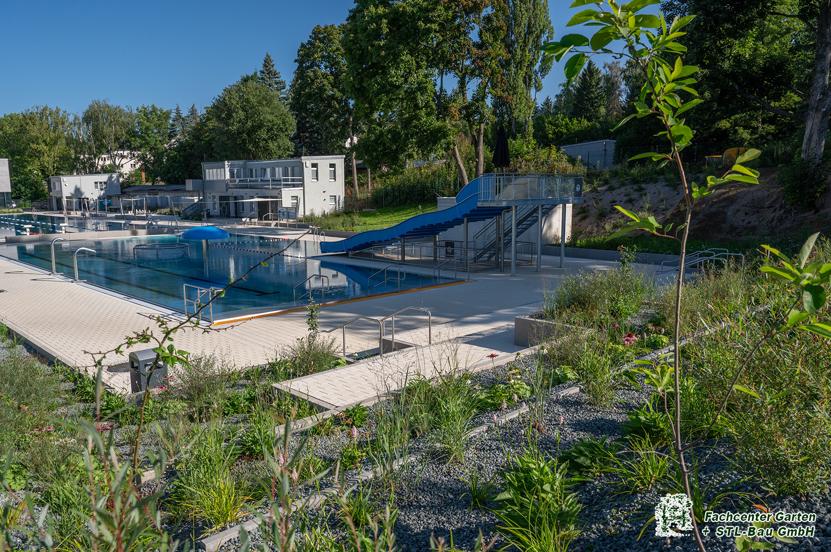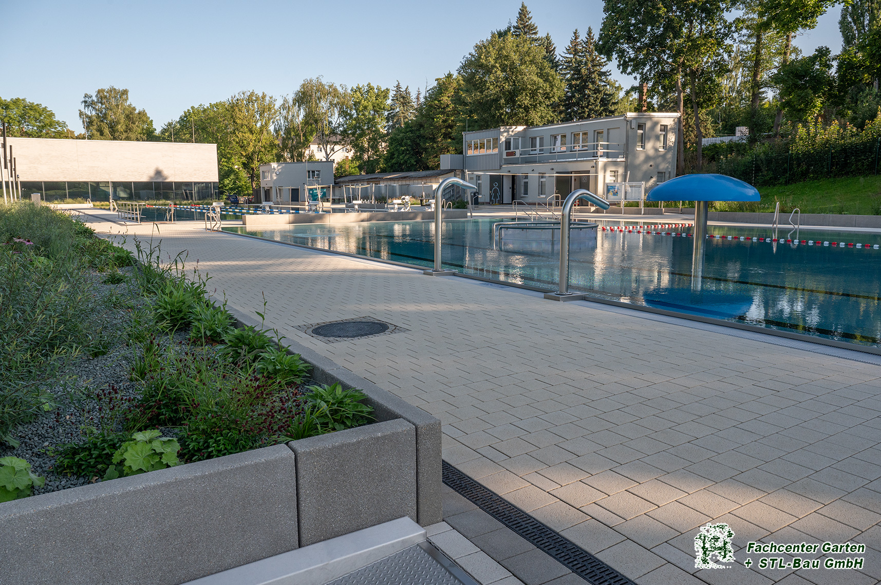 2025 Gestaltung der Außenanlage des Freibades Bernsdorf in Chemnitz. Baubeginn war von Augsut 2023 bis Mai 2025. Die Bauleistungen umfassten Kanalarbeiten, Entwässerungsarbeiten, Leitungsverlegung, Treppen- und Rampenanlagen, Pflasterarbeiten und Plattenverlegung, Sitzelemente, Stützmauern, Spielplatzfläche mit Spielgeräten, Beachvolleyballanlagen, Bepflanzung und Begrünung und der Neubau des Parkplatzes.